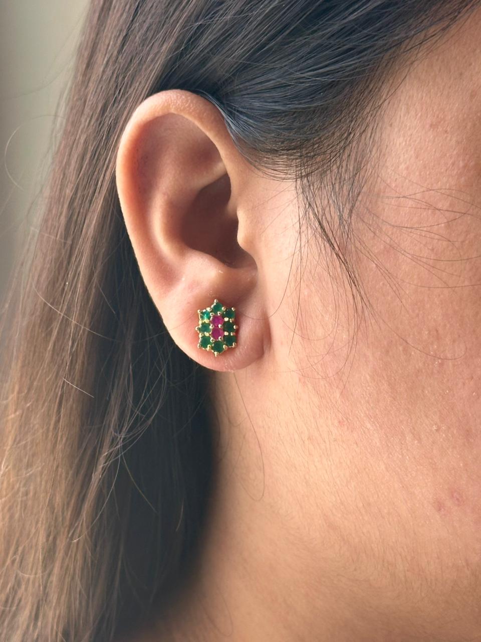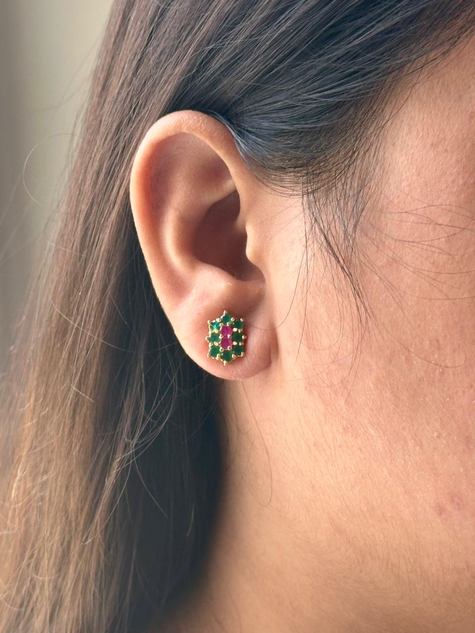 A vibrant whisper of timeless elegance for your everyday. These exquisite studs feature a delicate cluster of rich ruby and emerald tones, meticulously arranged to form a captivating mini-bloom on your ear. Reminiscent of Kunj a small groove, their compact design delivers a powerful pop of traditional color with a modern, understated grace. Perfect for those who appreciate heritage beauty and believe that true luxury speaks softly, yet leaves a lasting impression.