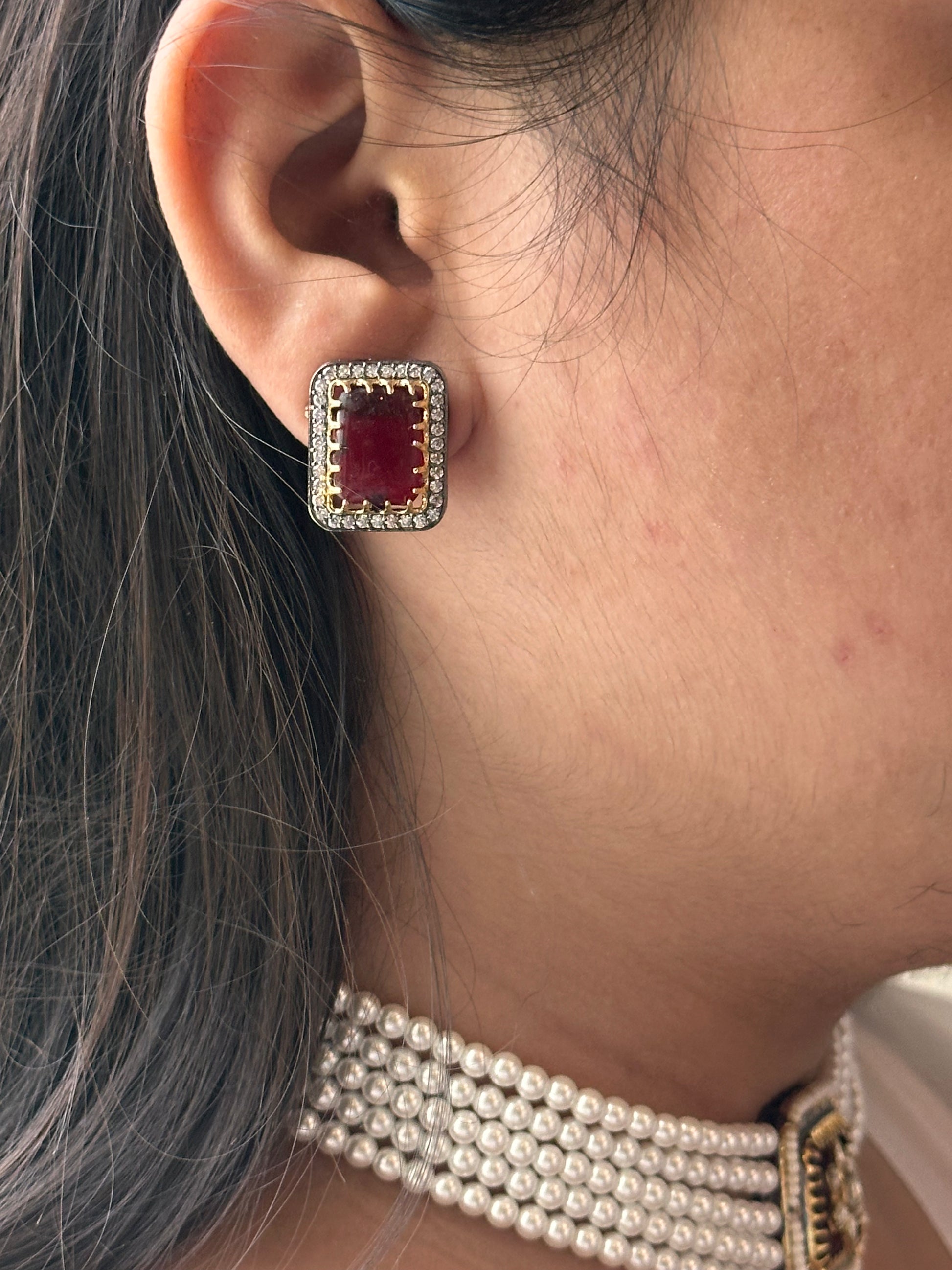 This Rani Haar is the quintessential piece of imperial elegance, crafted to make a subtle yet commanding statement. It features four perfectly matched strands of pearls that drape the neck with softness and grace. The centerpiece is a commanding square medallion with a rich ruby-red enamel center, delicately framed by micro-stones and gold-tone detailing, echoing the traditional artistry of royal courts. The matching square stud earrings complete the regal look. This set is the embodiment of quiet luxury: a piece of heritage and power that requires no volume to be utterly mesmerizing.